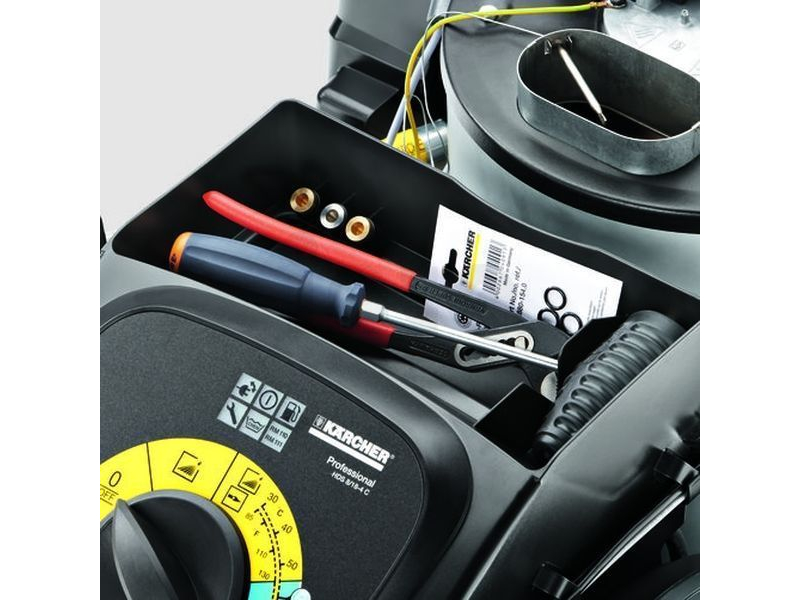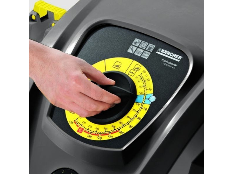 Ochrana proti tvorbě vodního kamene je řešena pomocí speciální kartuše, která se zasouvá do vyhrazeného prostoru tak, aby použití a aplikace byla co nejsnazší a nejsrozumitelnější. Pracovní tlak je plně regulovatelný v rozsahu 30 - 160bar, přisávání čistícího (desinfekčního) prostředku z integrované nádrže je možno nastavit v procentech. Teplotu vody lze nastavit v rozmezí 0 - 155°C. Ovládací stupeň Eco efficiency, který udržuje provozní teplotu 60°C za minimální spotřeby energie a paliva. Signalizace stavu zásoby paliva, čisticího prostředku a směru otáčení elektromotoru zvyšuje komfort provozu.